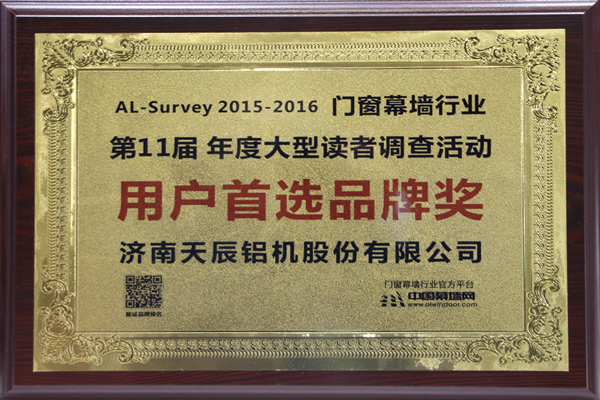 同期,由中國(guó)建筑金屬結(jié)構(gòu)協(xié)會(huì)主辦,中國(guó)幕墻網(wǎng)承辦的“第十一屆AL-Survey2015-2016中國(guó)幕墻網(wǎng)年度大型讀者調(diào)查評(píng)選活動(dòng)”頒獎(jiǎng)儀式在在廣州廣交會(huì)威斯汀酒店隆重舉行,天辰股份榮獲“用戶首選品牌獎(jiǎng)”。