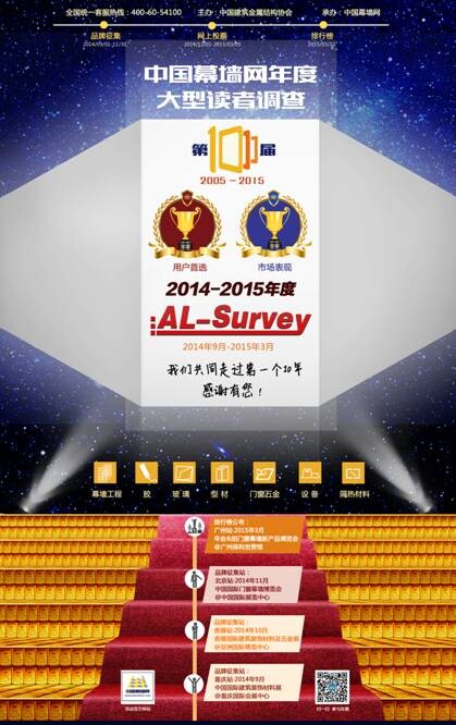 AL-Survey讀者調(diào)查活動全稱:中國幕墻網(wǎng)年度大型讀者調(diào)查暨“我最喜愛品牌”評選活動。(以下簡稱AL-Survey)我司濟南天辰鋁機股份有限公司作為門窗幕墻機械制造領(lǐng)域的資質(zhì)企業(yè),攜“天辰”品牌,強勢入圍本次調(diào)查活動。通過活動參與者的票