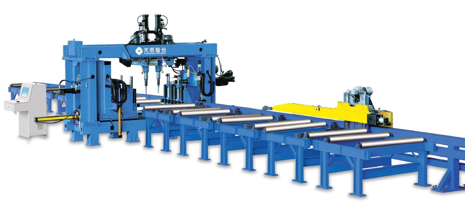 本機(jī)床主要用于對H型鋼、槽鋼、方管和矩形管等型鋼進(jìn)行鉆孔加工,它主要應(yīng)用于鋼結(jié)構(gòu)建筑、橋梁、電站、海洋石油井平臺(tái)、塔桅等鋼結(jié)構(gòu)行業(yè)。機(jī)床一共采用4個(gè)主軸: 左單元和右單元各有1個(gè)主軸分別對型鋼的兩個(gè)翼板進(jìn)行鉆孔加工;上單元有2個(gè)主軸,對型鋼的腹板進(jìn)行鉆孔加工。上單元能裝夾2種不同直徑的鉆頭,可以同時(shí)加工腹板上兩種不同直徑的孔。和腹面上只有單個(gè)主軸的機(jī)床相比,當(dāng)腹板孔徑變化時(shí)不需要手工更換鉆頭,因此該機(jī)床大大節(jié)省了換刀時(shí)間,顯著提高了加工效率和加工精度。該機(jī)床是我公司專利產(chǎn)品。