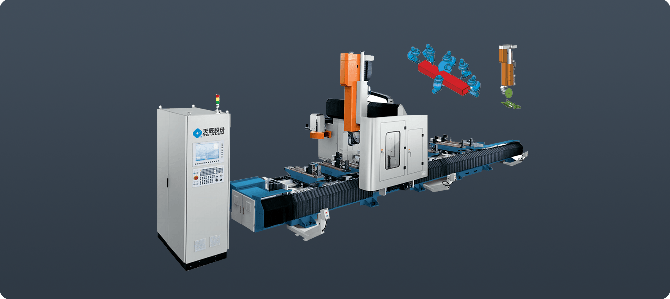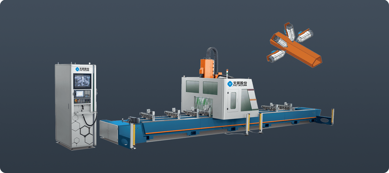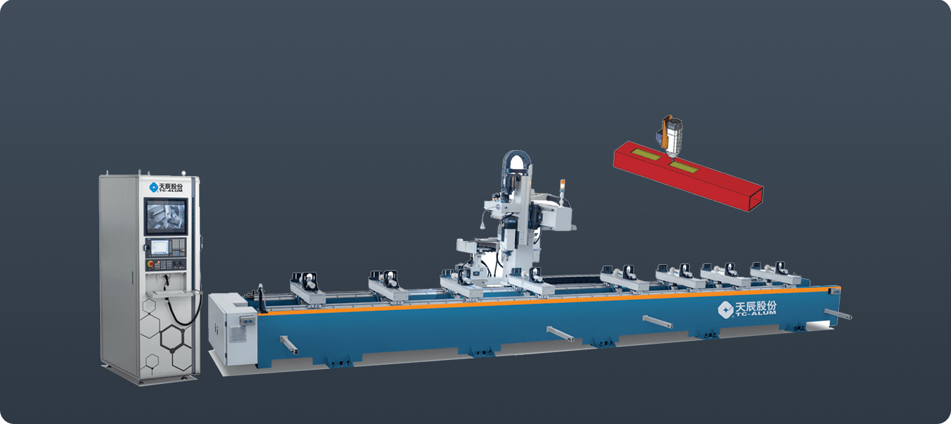 用于門(mén)窗幕墻鋁型材及工業(yè)型材的孔、槽及輪廓形狀等復(fù)雜工序的加工,具備銑削、鉆削、攻絲、切割等功能,實(shí)現(xiàn)5面加工,5軸RTCP插補(bǔ),可實(shí)現(xiàn)復(fù)合切割。